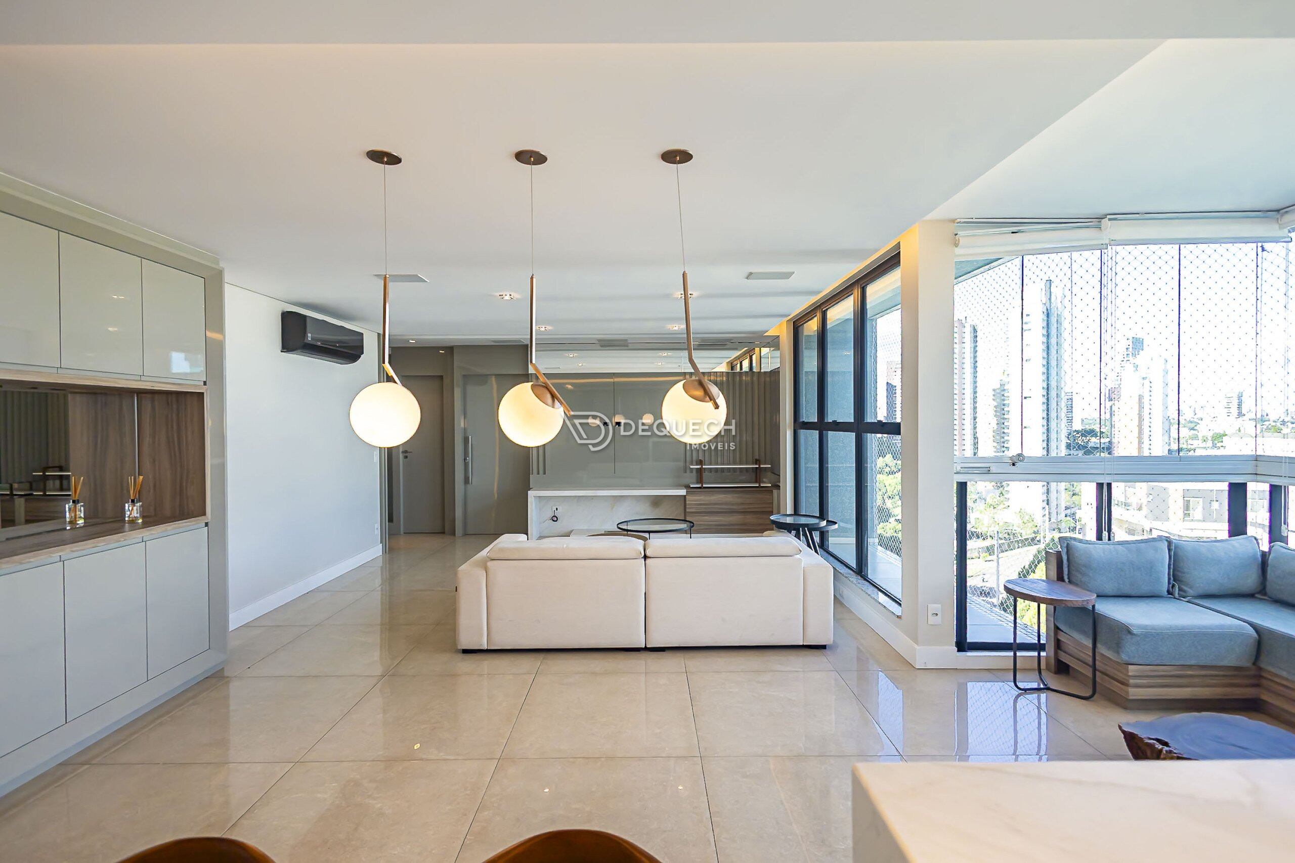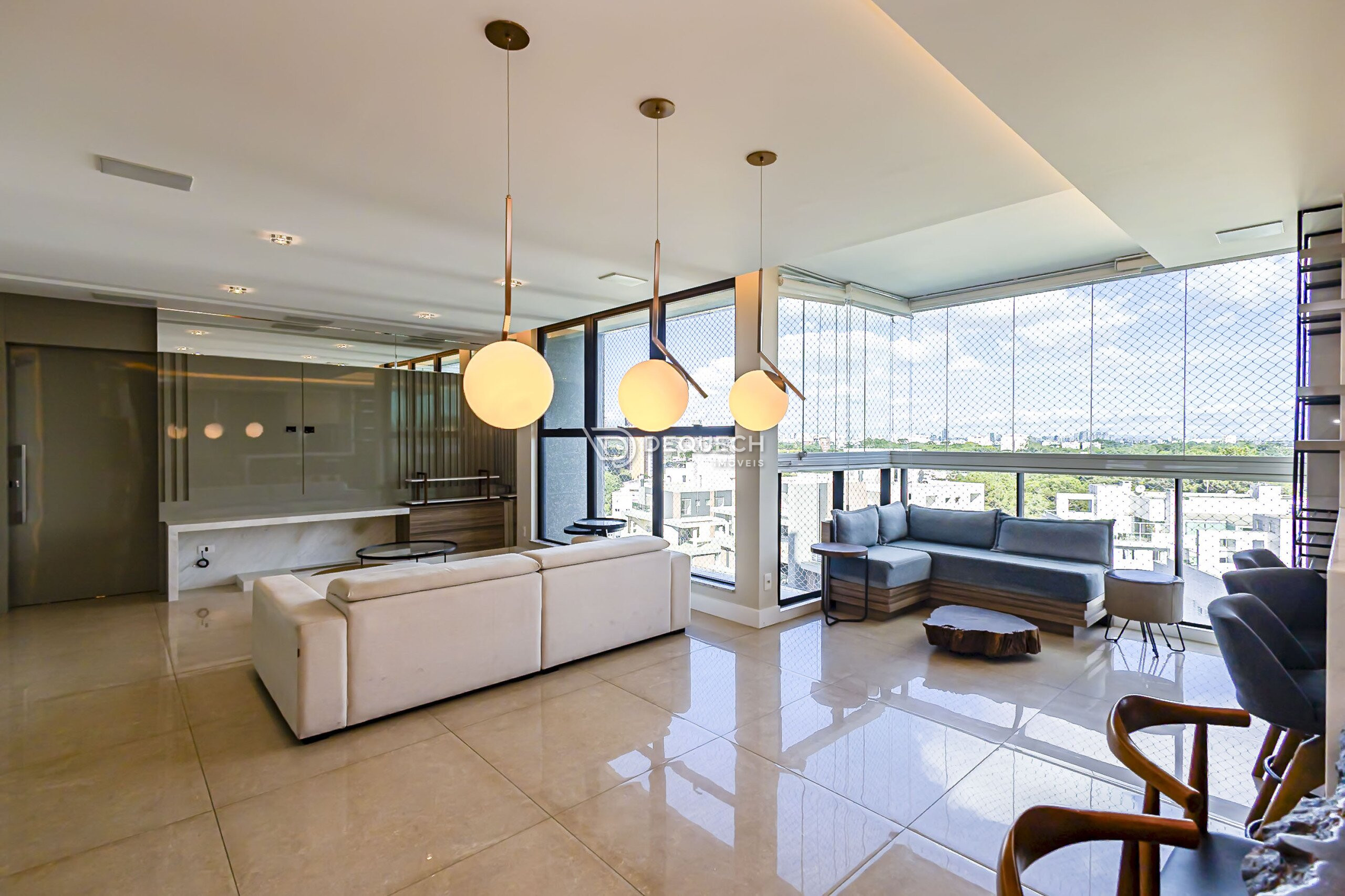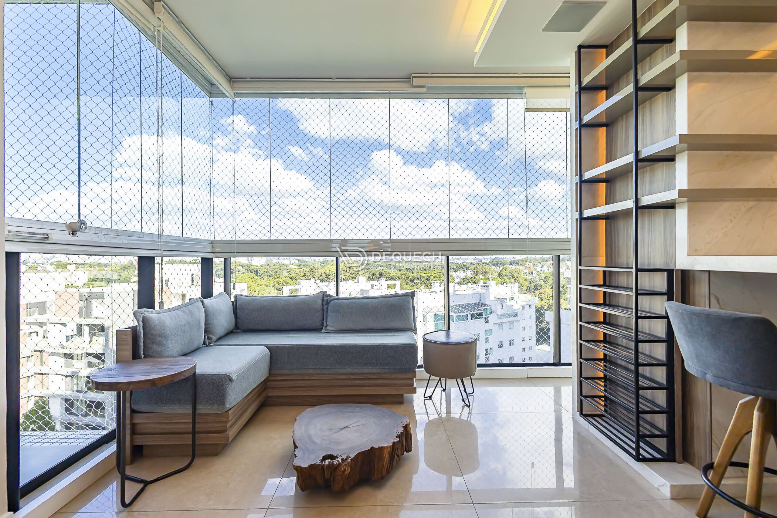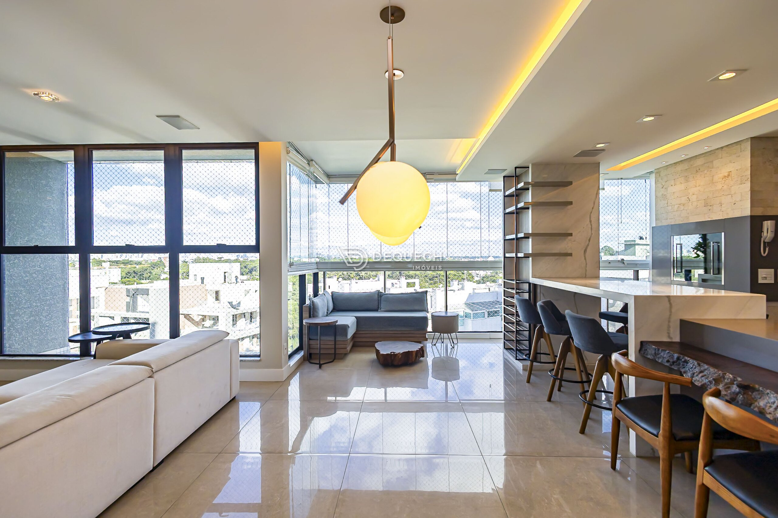 A varanda com fechamento em vidro agrega metragem útil ao ambiente, oferecendo excelente luminosidade