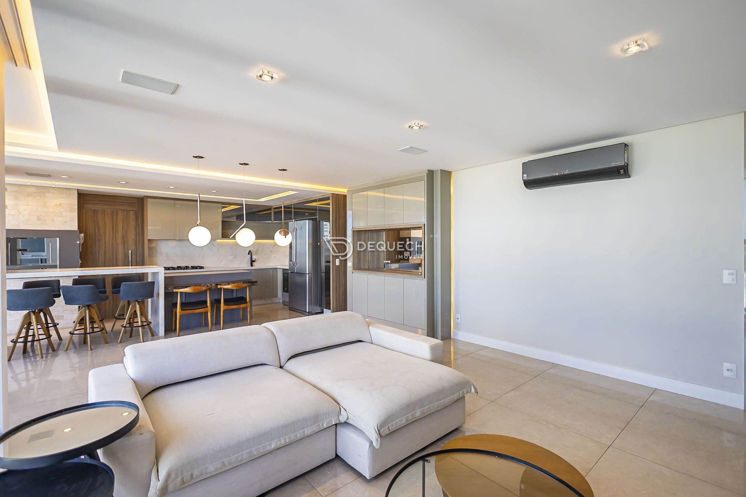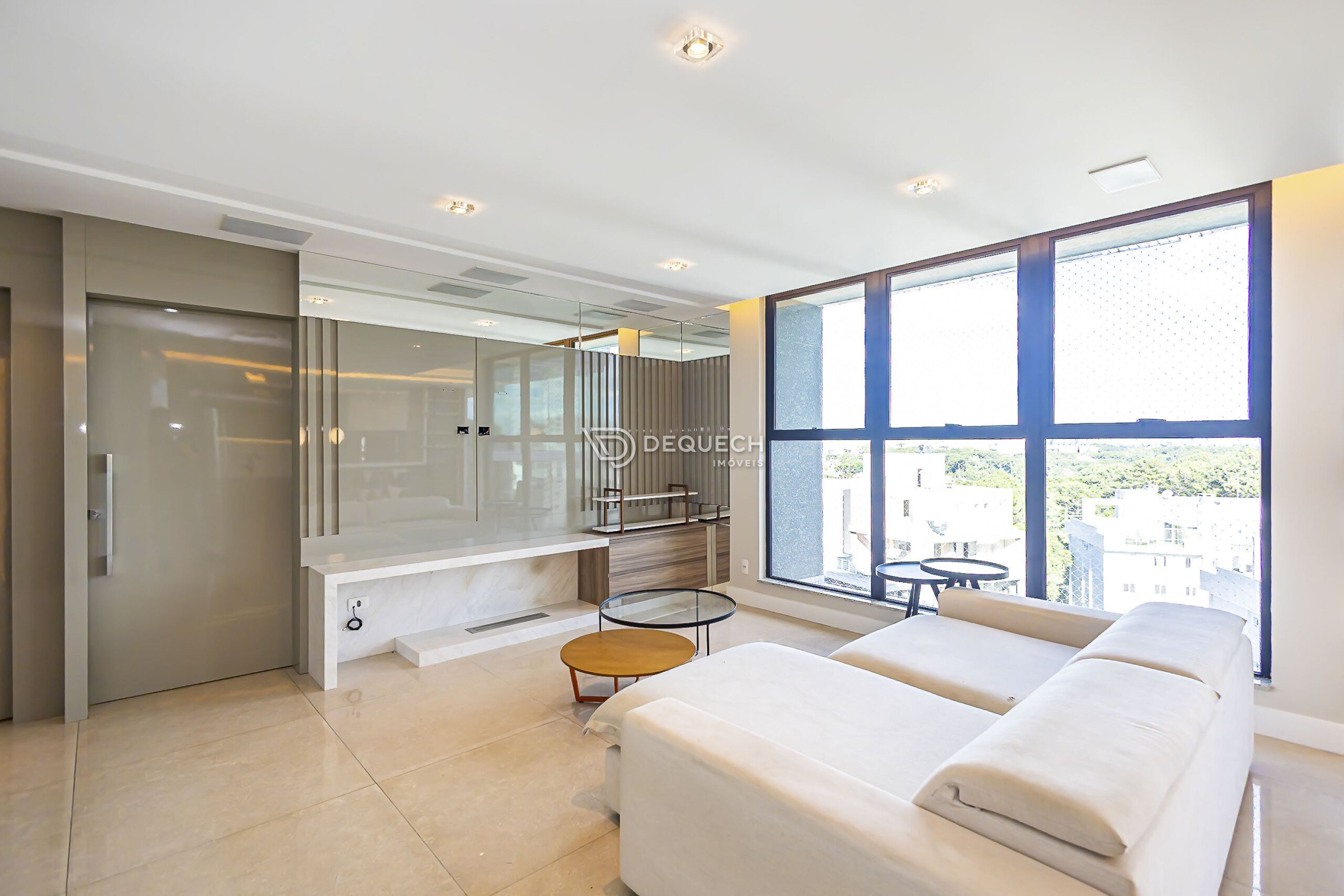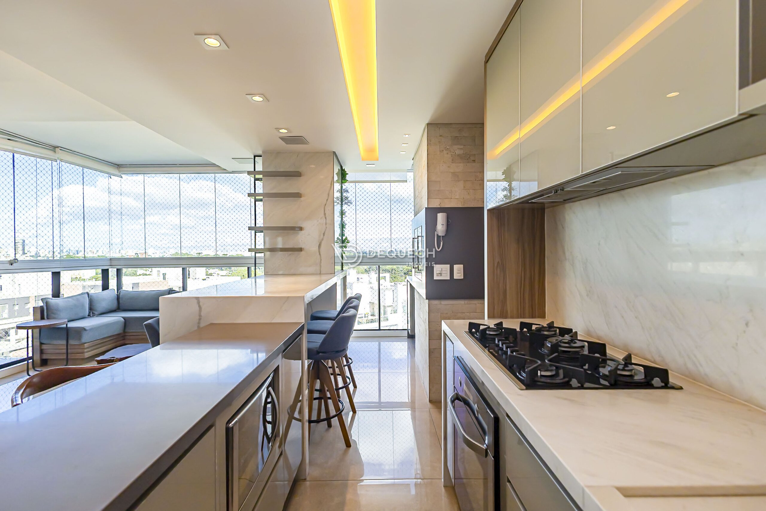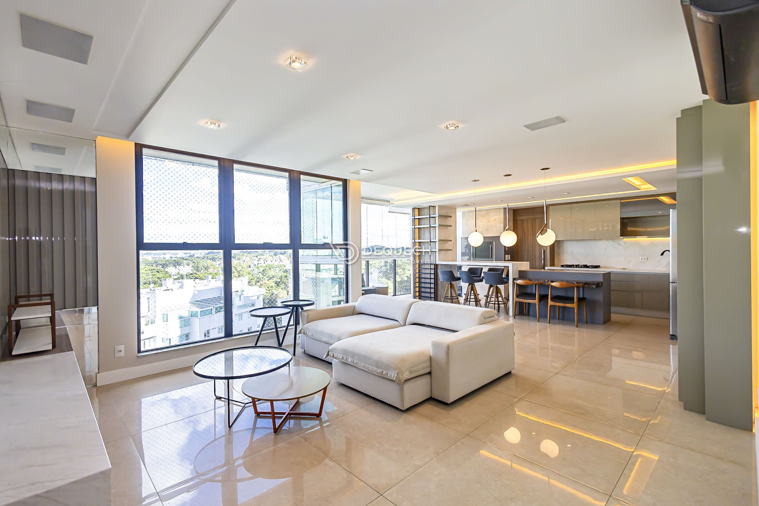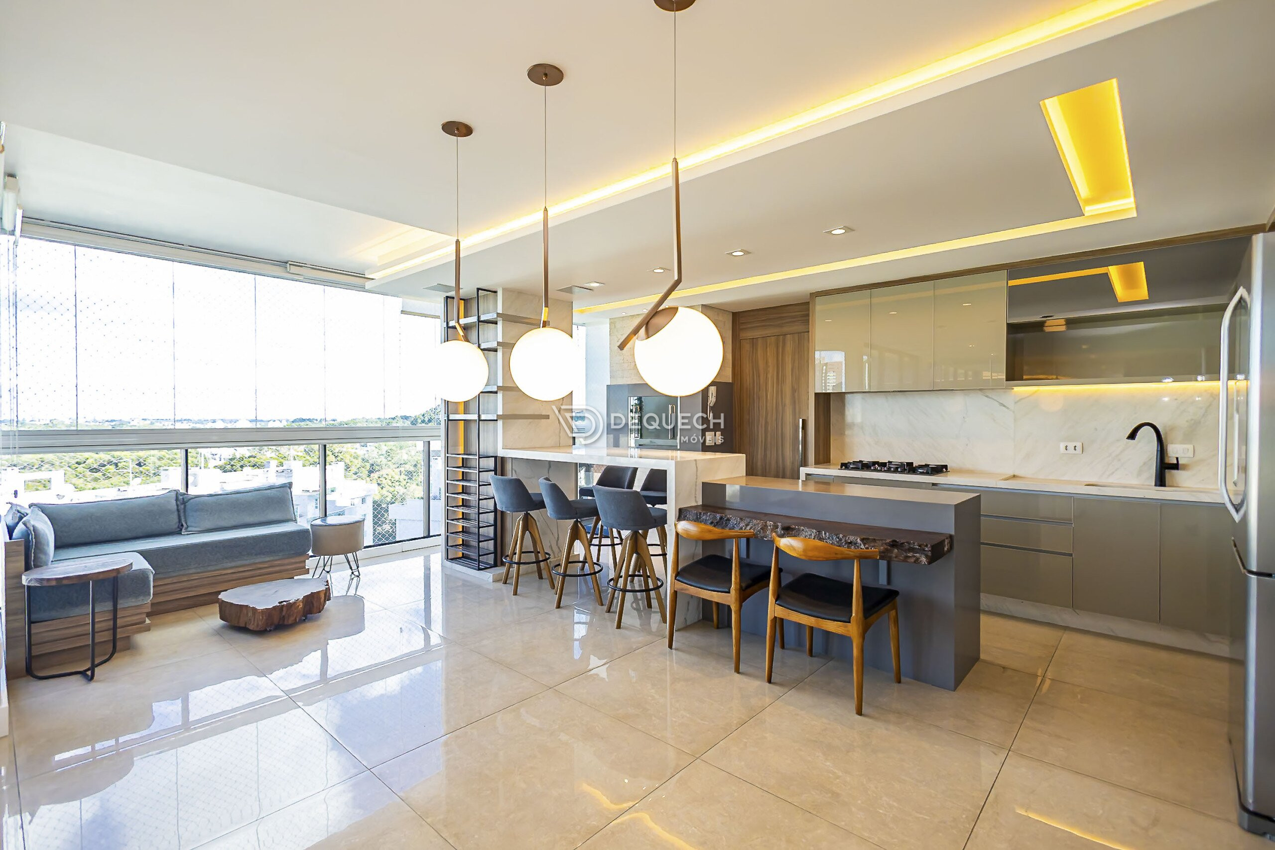 A varanda com fechamento em vidro agrega metragem útil ao ambiente, oferecendo excelente luminosidade