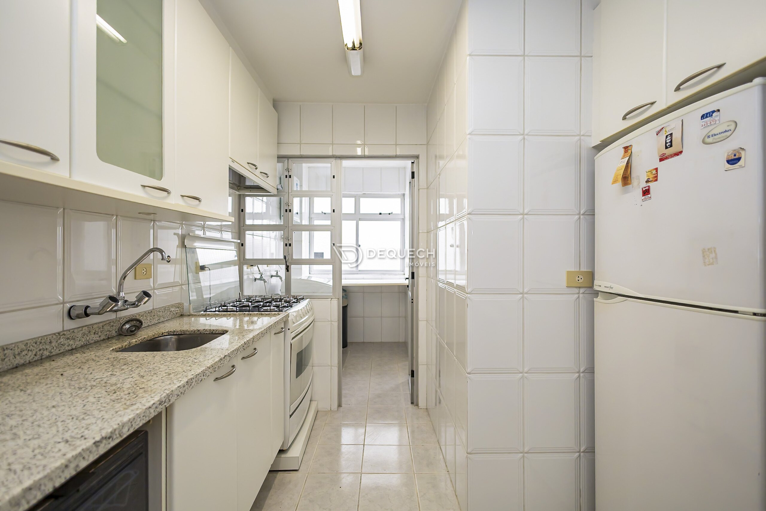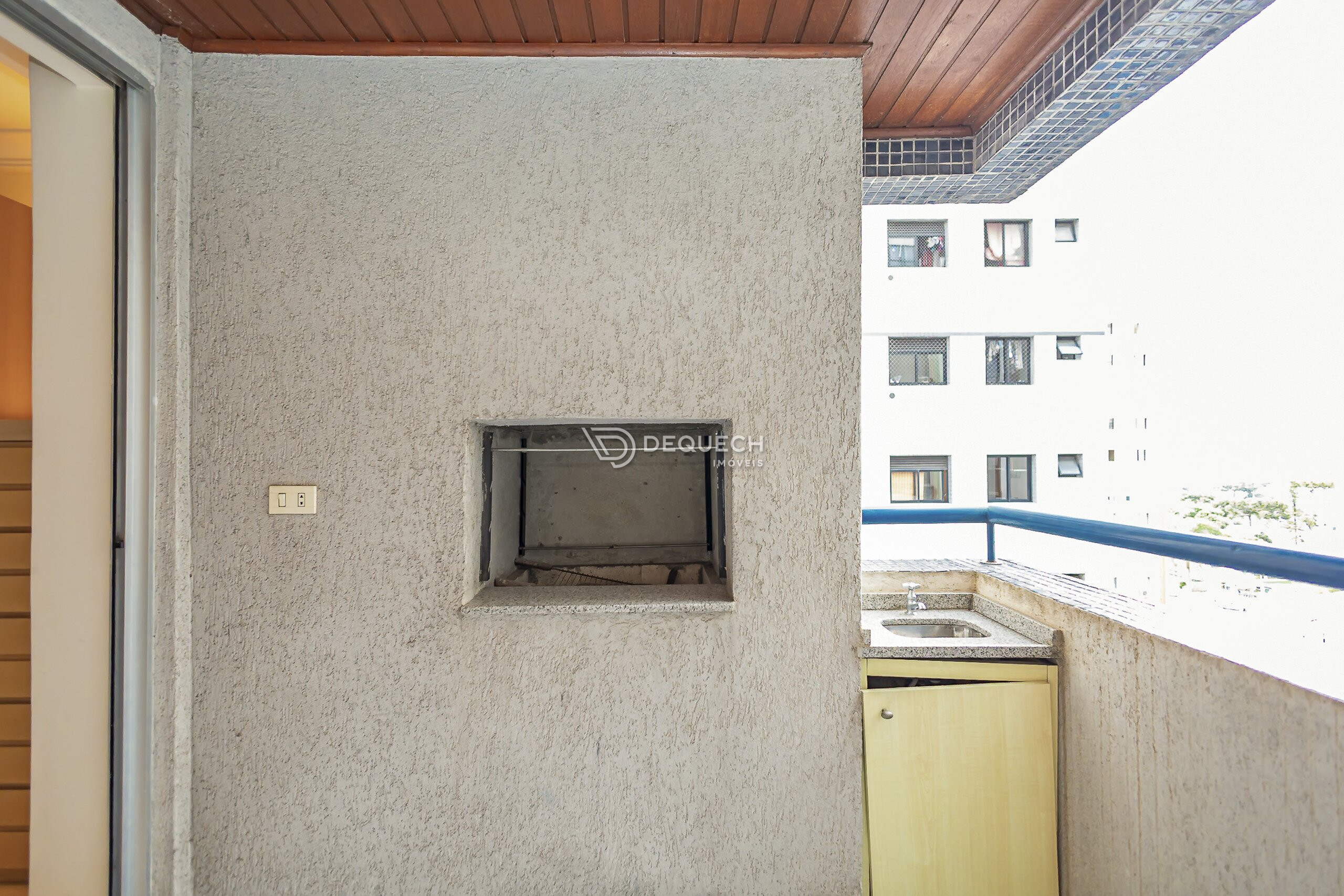 sacada com churrasqueira a carvão, cozinha, área de serviço e dependência de funcionário.