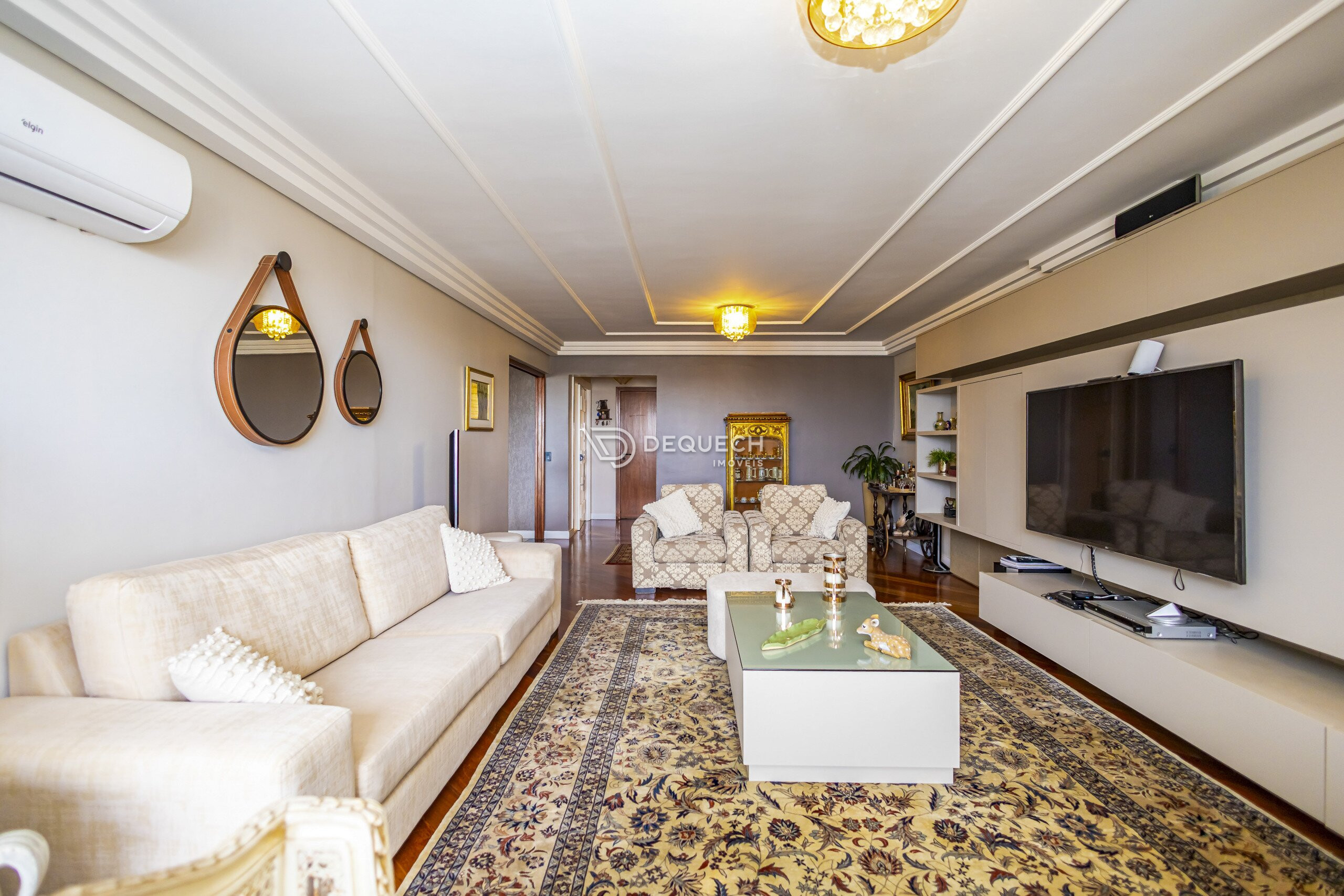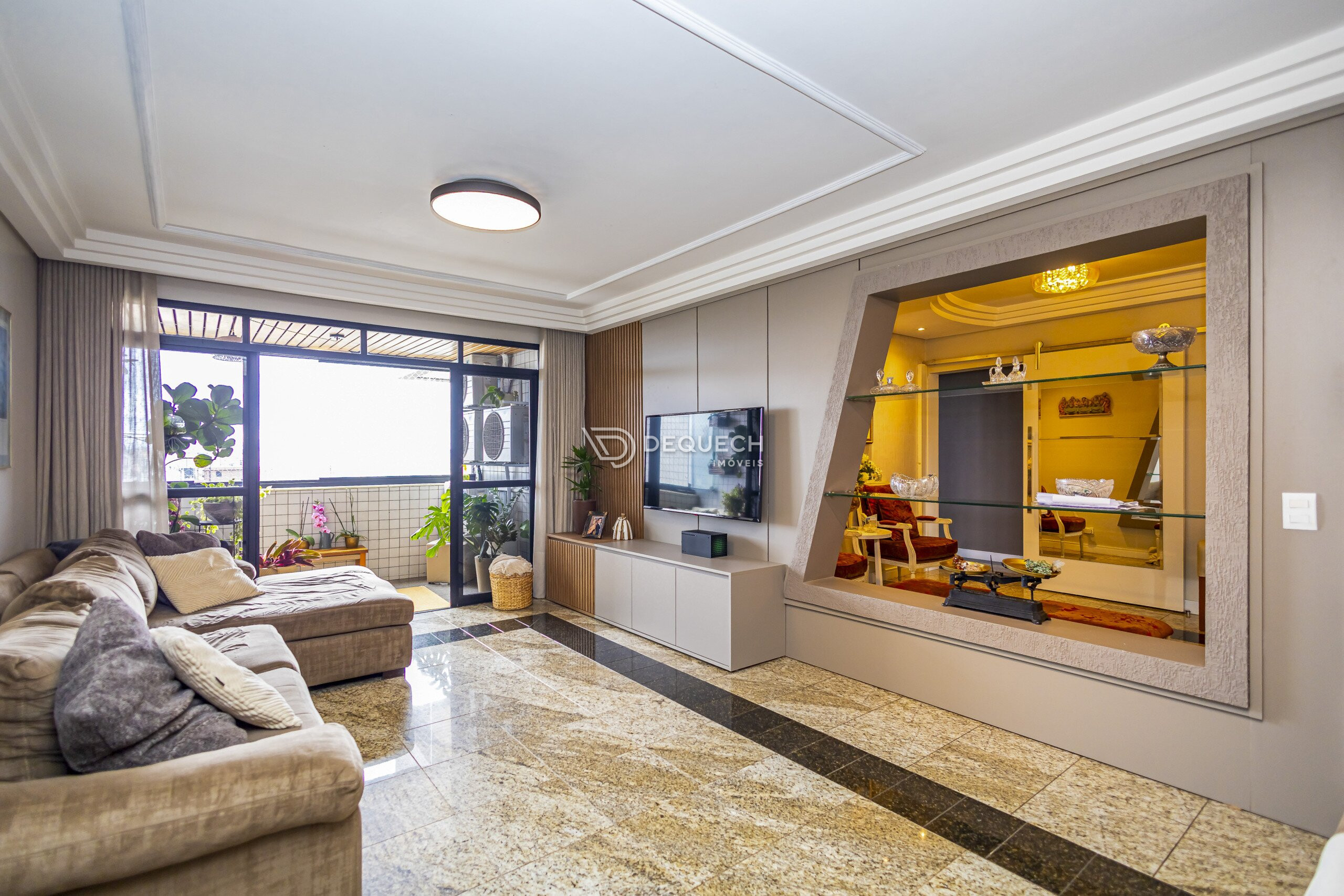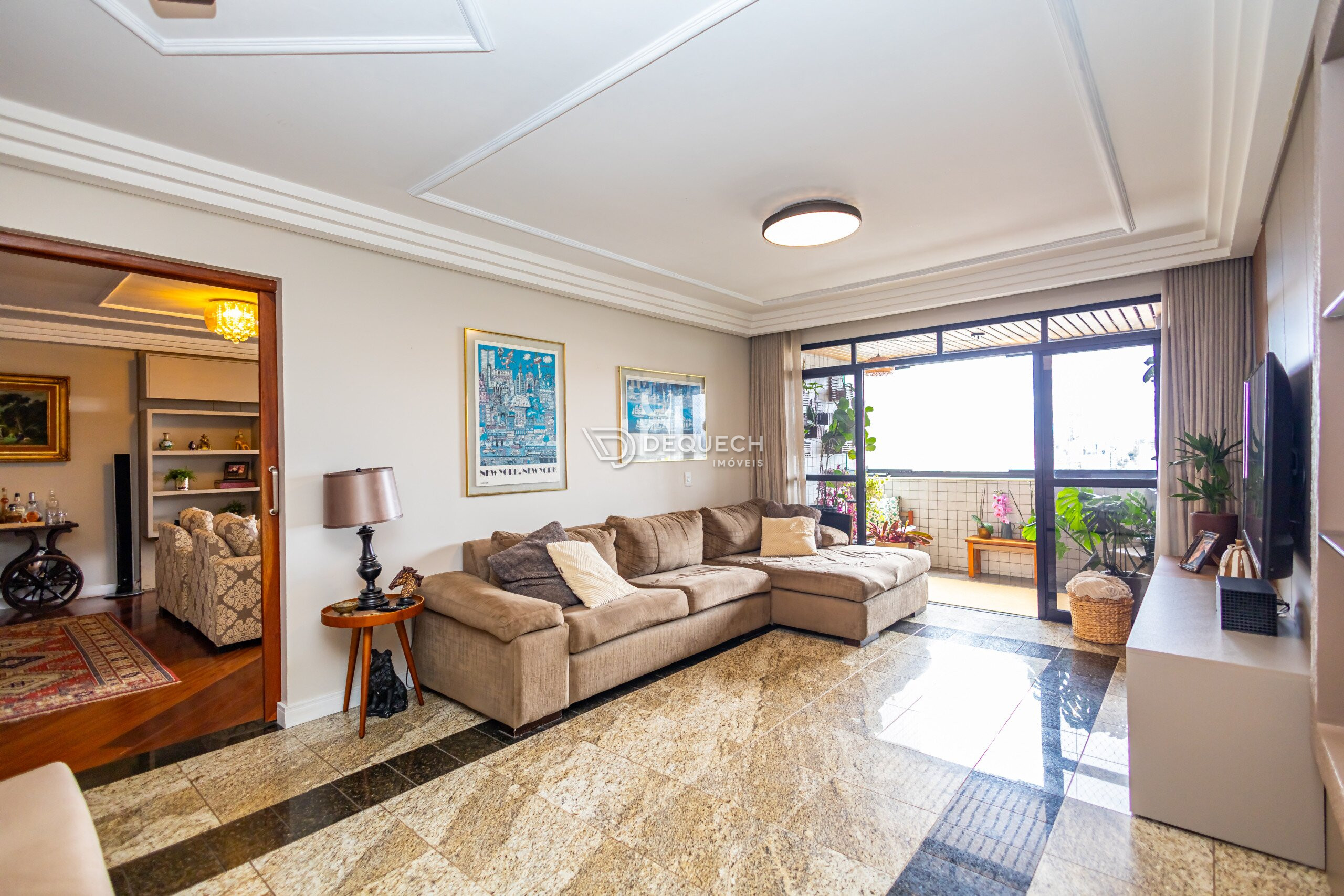 A planta é bem distribuída, com 3 salas independentes, que podem ser integradas conforme a necessidade. A sala de jantar se conecta à sacada com churrasqueira. São 4 quartos, sendo 2 suítes, além de dependência de serviço completa, hoje usada como depósito e quarto de apoio. A lavanderia é ampla e bem ventilada.